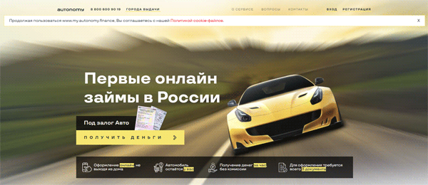 Мы первая компания в Российской Федерации, предоставляющая займы под залог Авто, на банковскую карту онлайн. Вам не нужно встречаться с представителем компании или приезжать в офис. Мы работаем по всей территории Российской Федерации круглосуточно без выходных. Чтобы получить деньги вам достаточно заполнить заявку на получение денег. При одобрении займа деньги поступят на вашу банковскую карту или в систему выдачи наличных Contact.